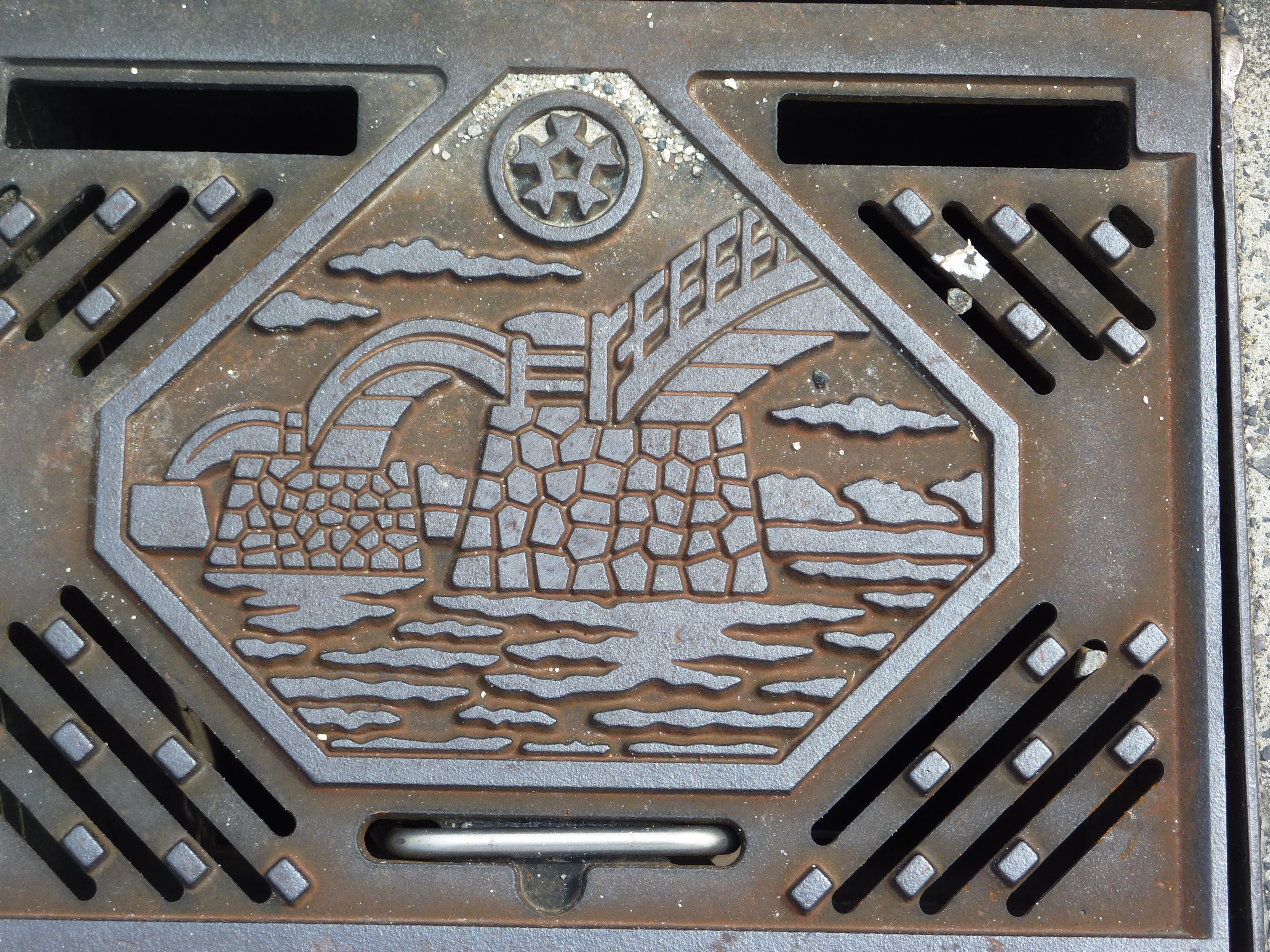 Last Sunday we decided to check out the Iwakuni train station and try taking the train somewhere – just for practice. We headed out on foot on Sunday morning. And to start off my blog with something pretty, here’s a picture of a manhole cover (or is it a personhole cover these days). Anyway, they are quite lovely to look at here.