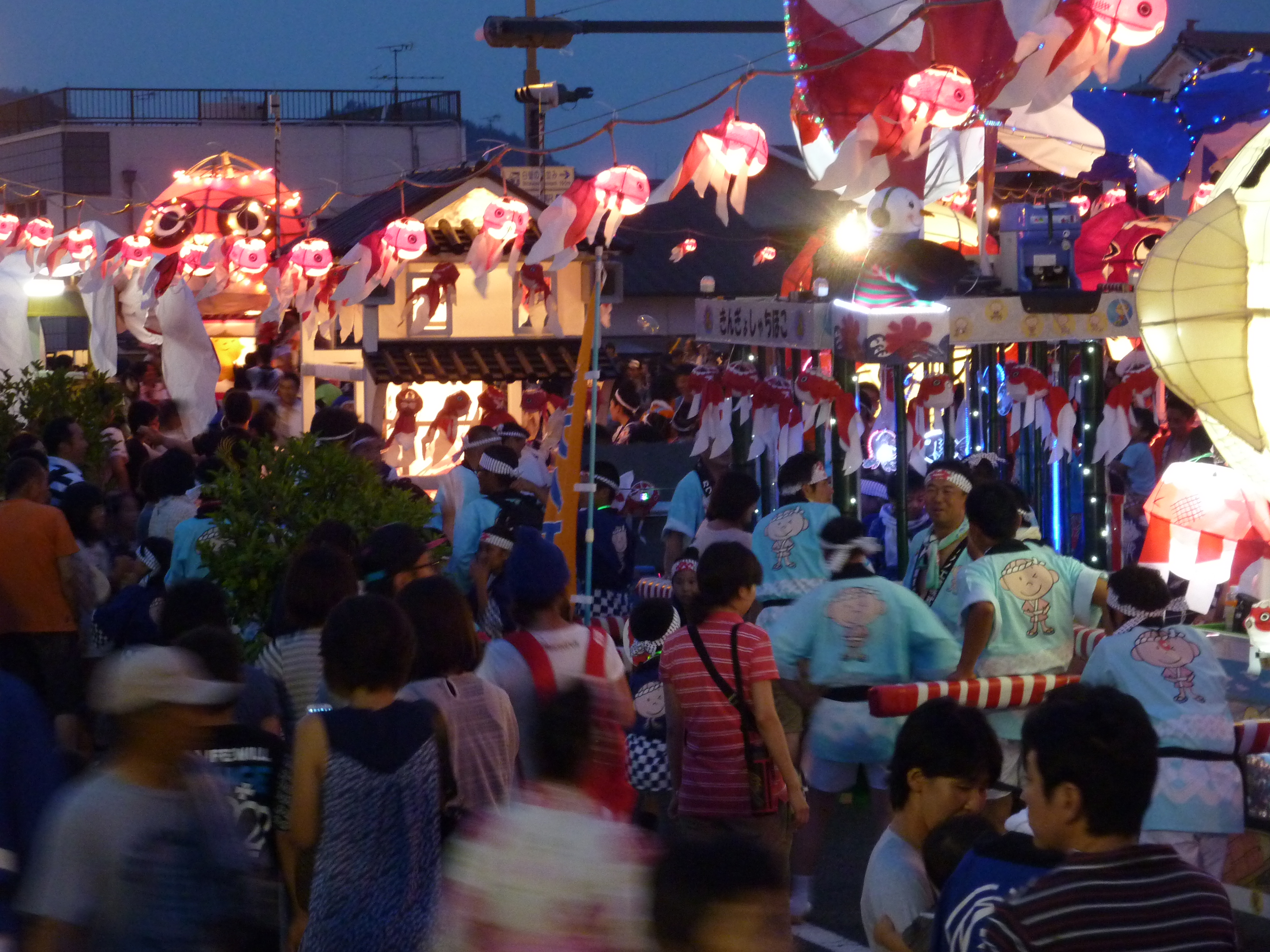 Last night we took the train south to the town of Yanai to experience our first Japanese Festival – The Goldfish Lantern Festival. There seem to be festivals happening all the time all over Japan. When we got off the train at 1745 we were greeted with this street scene. Lots of people gathering, vendors selling trinkets and lots of food on a stick.