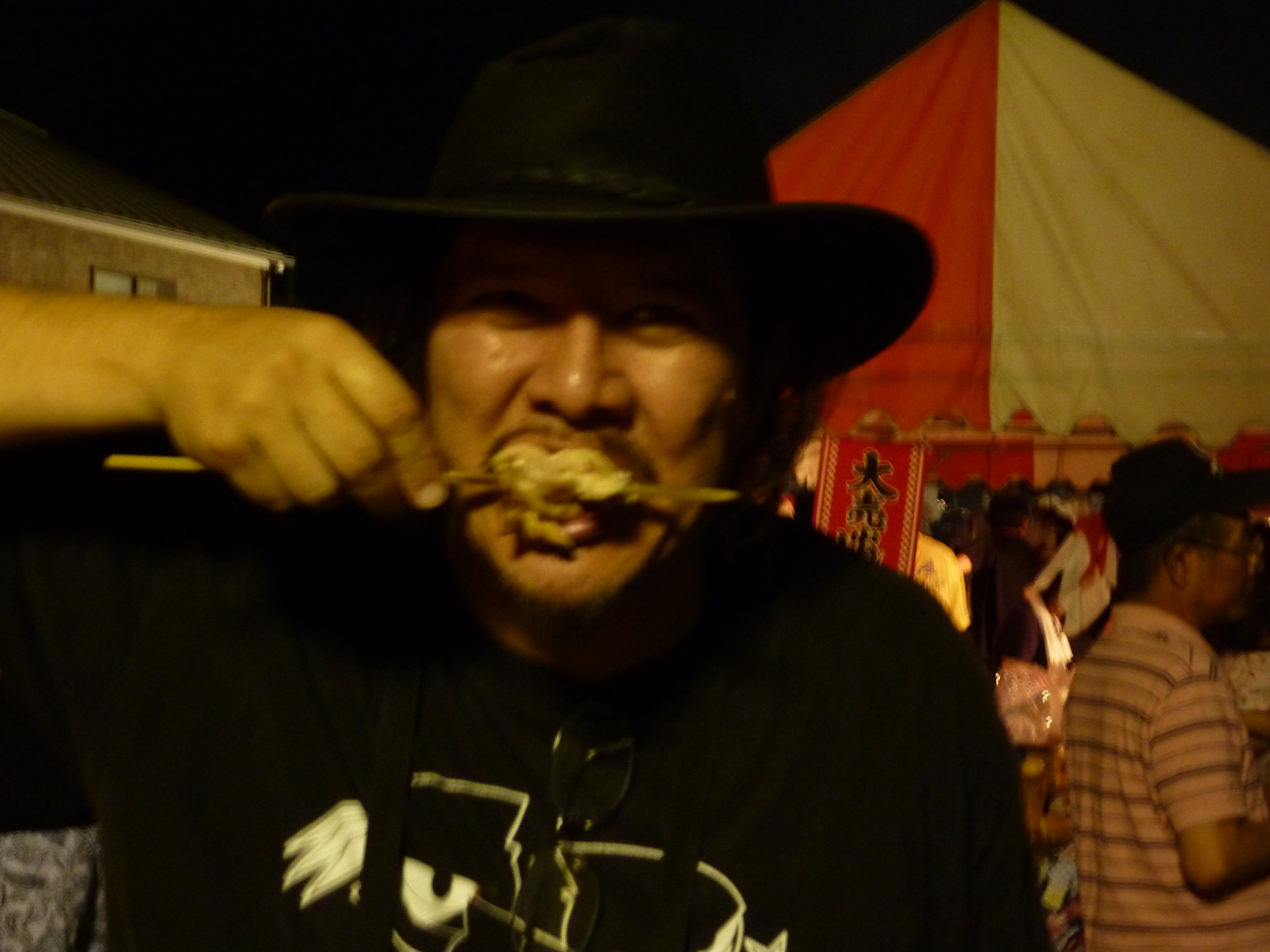 Our friend Steve eating chicken on a stick