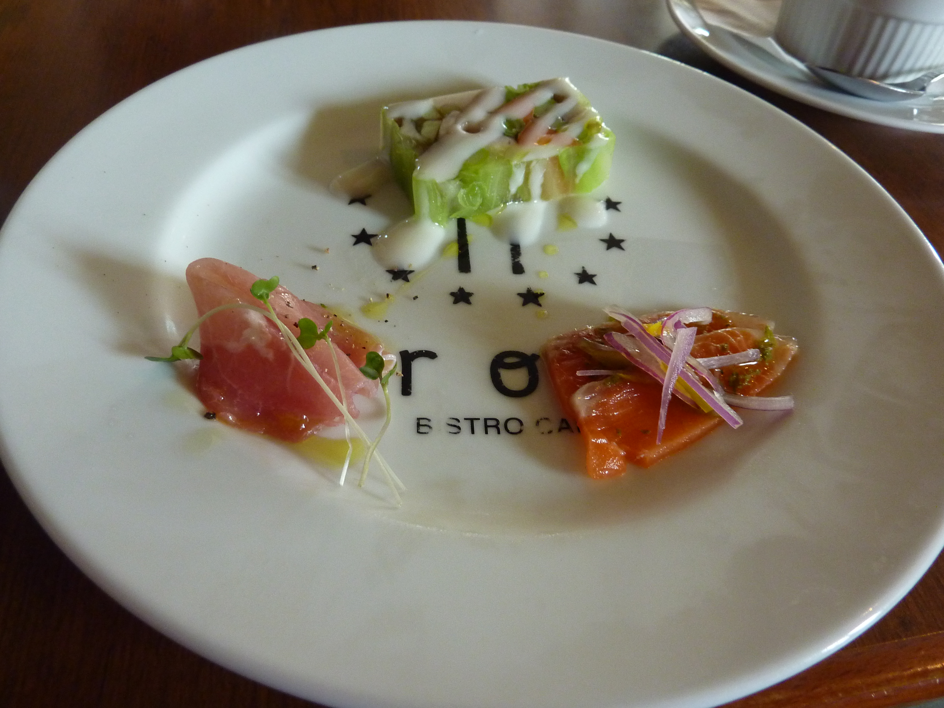 First course – salad. A little prosciutto, a little salmon, a little asparagus aspic.