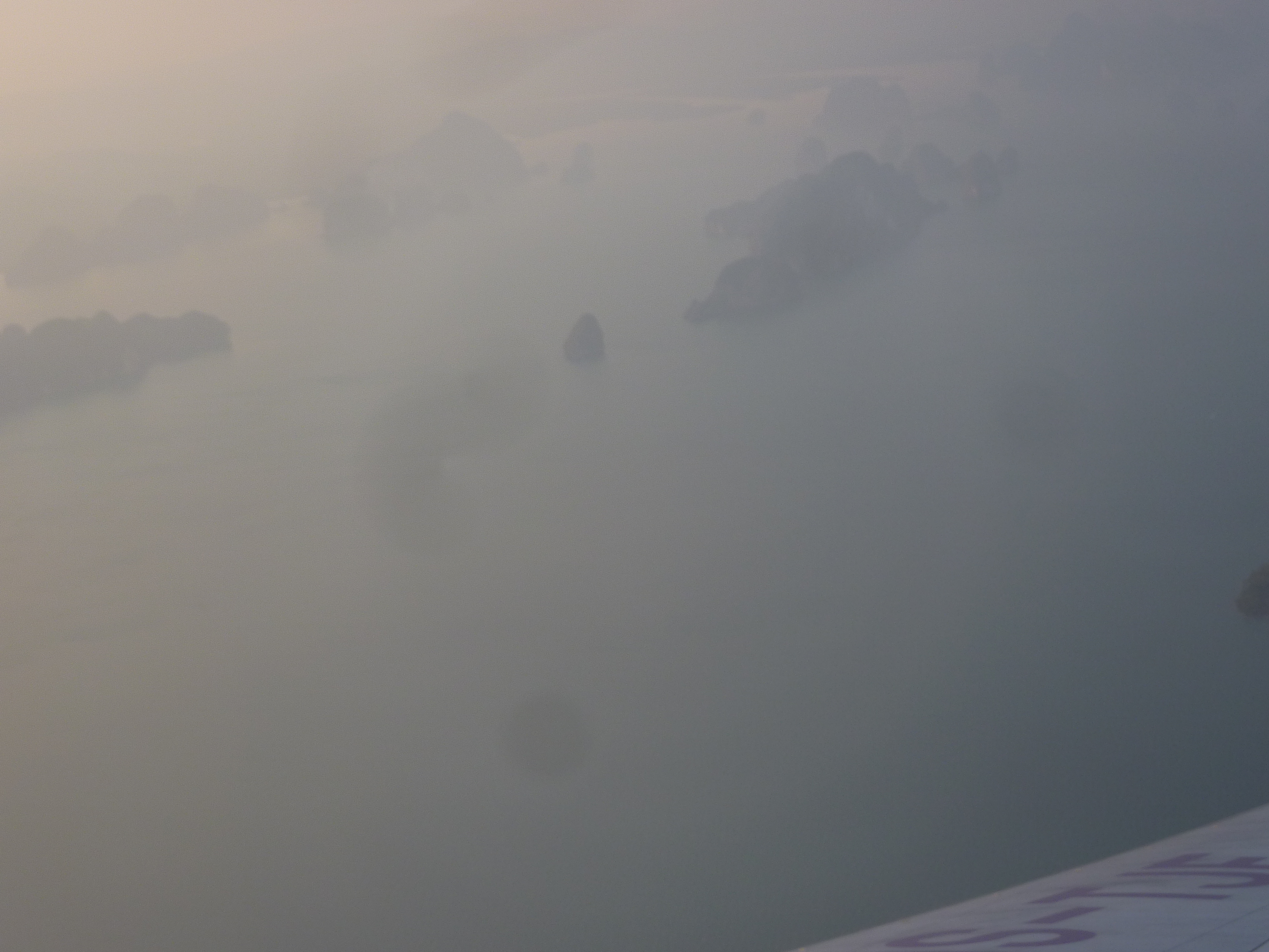 On to Phuket.  Bangkok is a very smoggy city because we could barely see the buildings and not for very long.  It was hazy most of the way but as we got close to Phuket and starting our decent we could see many small islands that looked like they’d been splattered about.  Look very closely.