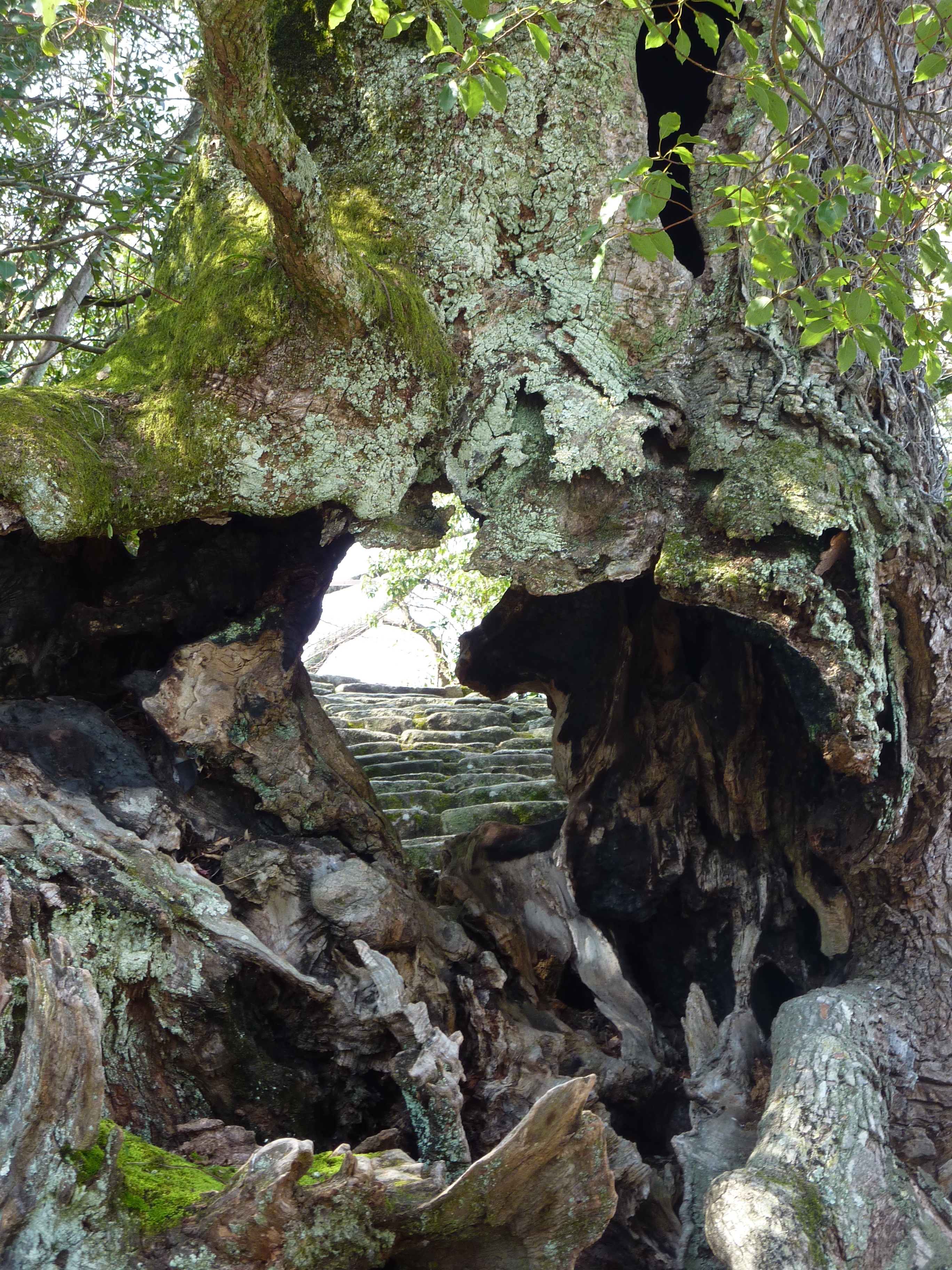 – From here we explored the sights and shops around Miyajima village. Here we came upon the “World’s Larges Rice Scoop.”Now it was time to start our hike up to the observatory high atop Mt. Misen. There is a “ropeway” (which we would call a tram) for those who don’t want to do the 1.5 hour hike to the top – which seems to be just about everyone. There are three main paths to choose. We picked the middle one which turned out to be straight up.It was a very cool hike, about 2 kilometers if you didn’t take all the side trails. Along the way we checked out the Daishoin Temple. – – –