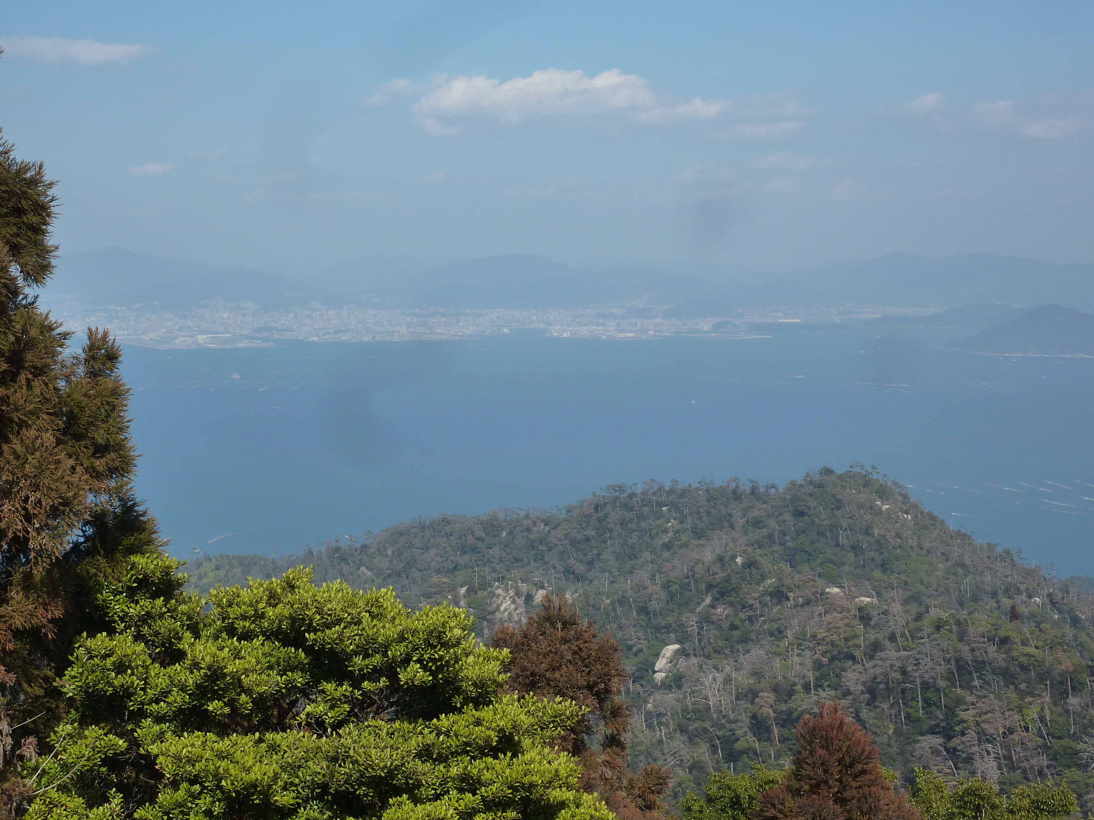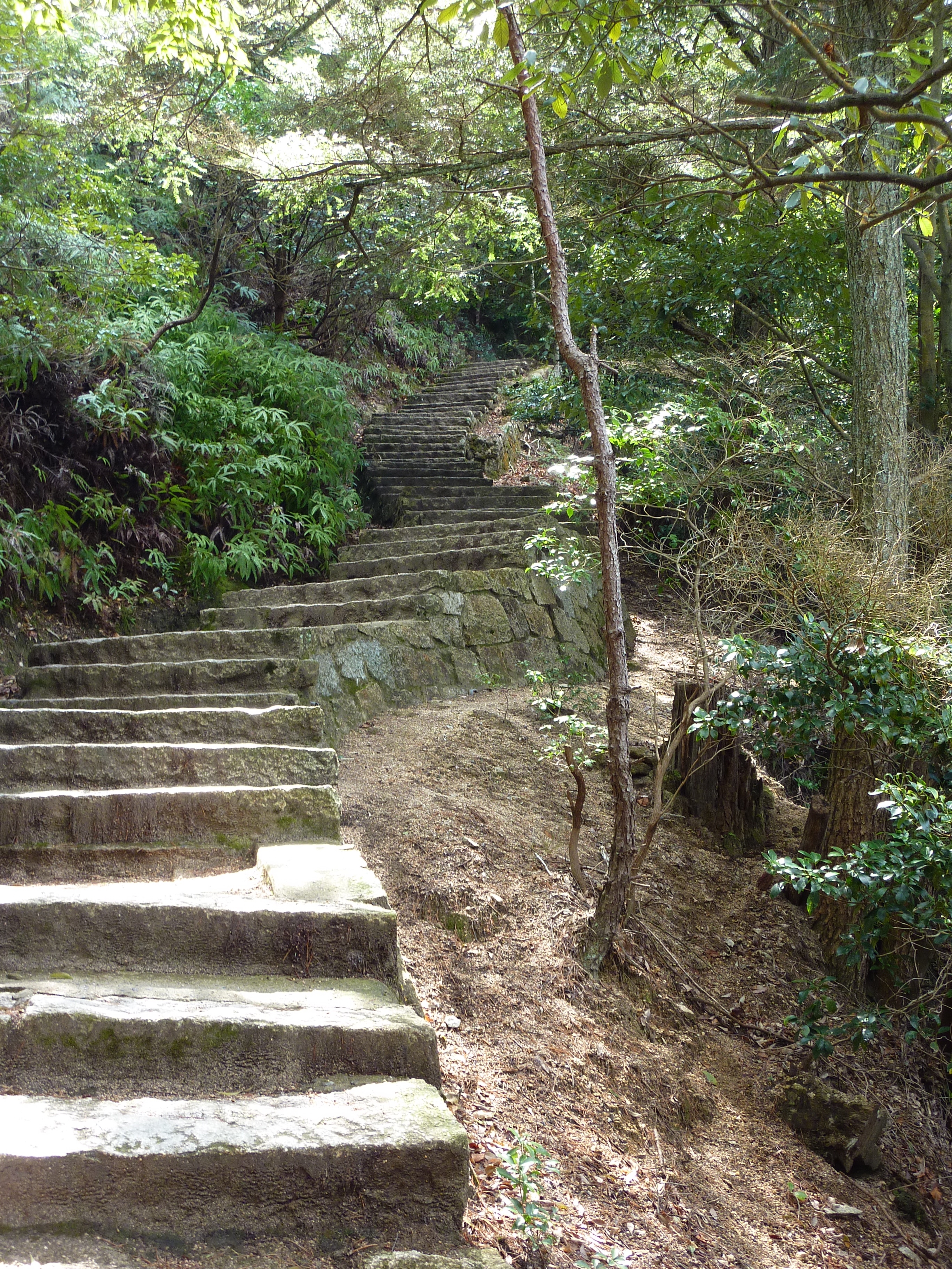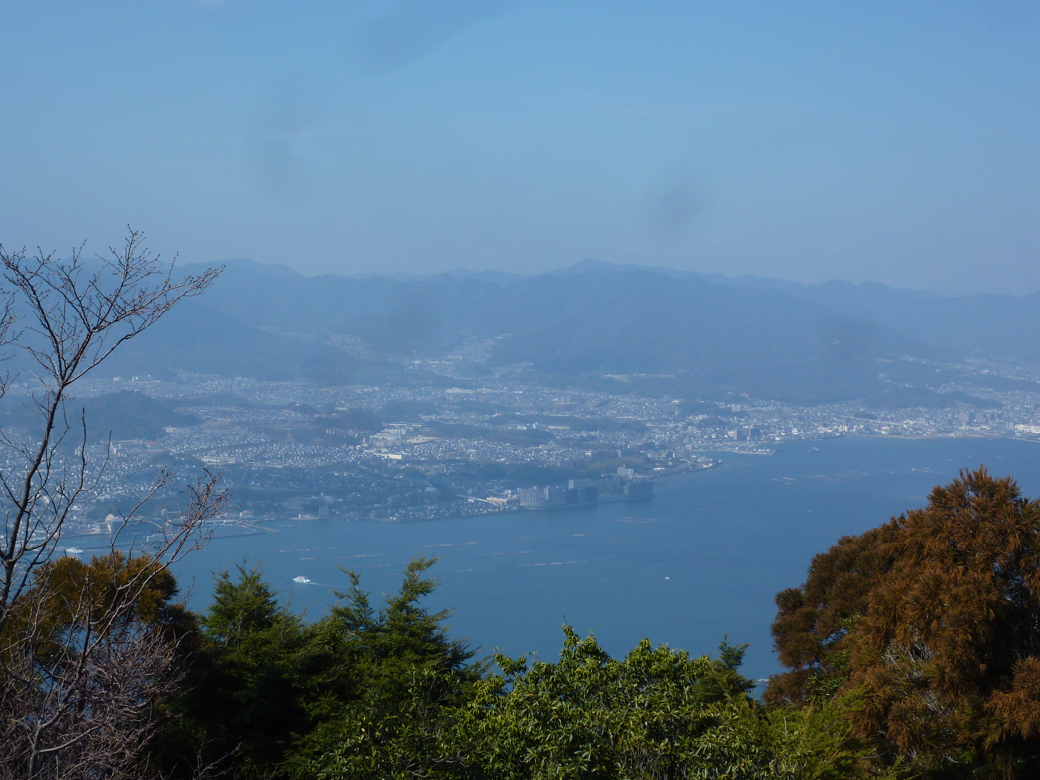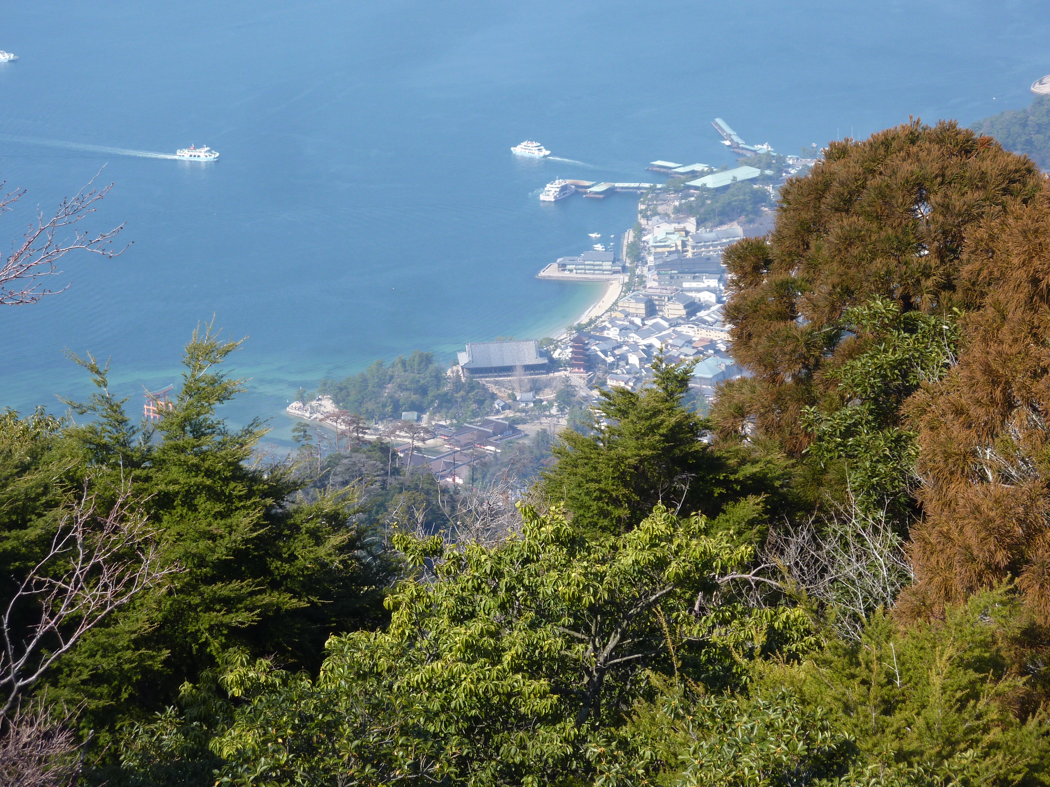– To the topFrom here we climbed up to the observatory where we had a 360 degree view of the world!Hiroshima to the NorthMiyajimaguchi to the EastMiyajima Village below Someone told us there was food at the top but – no food. So, time to head back down. This time we took a different path, equally beautiful. – – Down – – down – – down