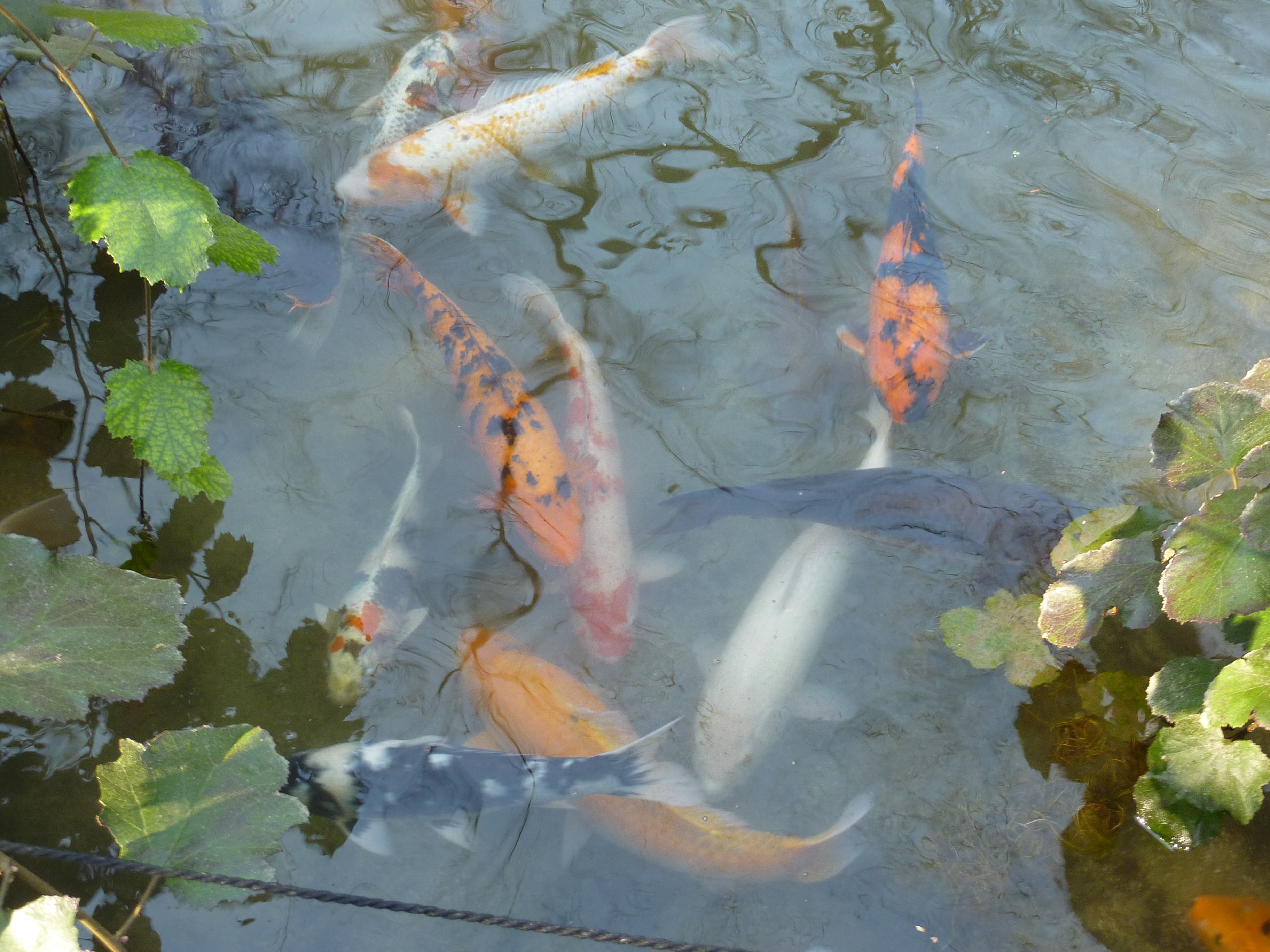 As we near the bottom of the mountain we learn of a great storm (one of many over the years) that caused a lot of damage to the town below and in 2005 an erosion control project was established “in the Japanese garden style.” “Rocks were strategically placed in streams to encourage the water to flow in certain directions, creating scenes that look more like paintings than nature itself. The water from Momijidani stream flows perfectly down a manicured stream bed and shimmies over a stone wall. The stone wall has evenly spaced troughs of predetermined widths in it to create pleasing water flows” according to Amy Chavez.Next we came upon a pond with super-sized koi.Back in the village we had to check out the five-storied Pagoda, built in 1407. It’s 28 meters high and very pretty.OK. We’re officially pooped and hungry. Time for aMiyajima Beer!and some fresh grilled oysters-on-a-stick!What a great, beautiful day.And here are some bonus pic’s for you, Eileen, my favorite knitting teacher in San Diego. More sights along the trail today. – – –