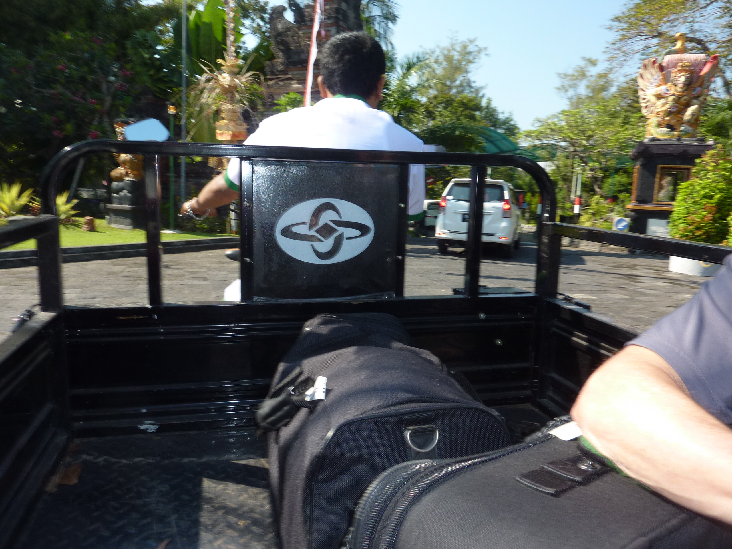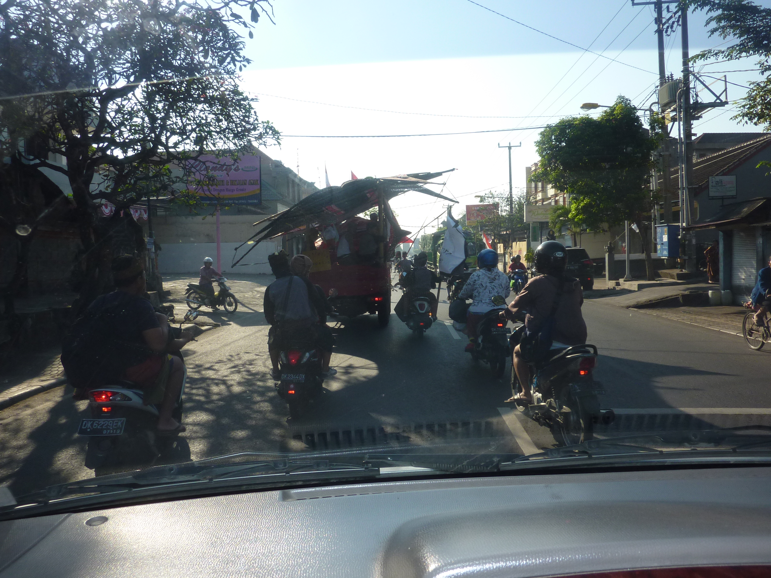 Side note and sights: Bali has lots of kite festivals and we see kites flying high in the sky all the time. These festivals are a big deal and there was a big festival gathering in Sanur so we saw several trucks carrying huge kites. These kites are so big it takes 30 guys to fly them! So when a kite truck goes by you know it ’cause there’s a lot of honking and hoopla with the entire entourage hanging on the truck and riding scooters and waving big flags.