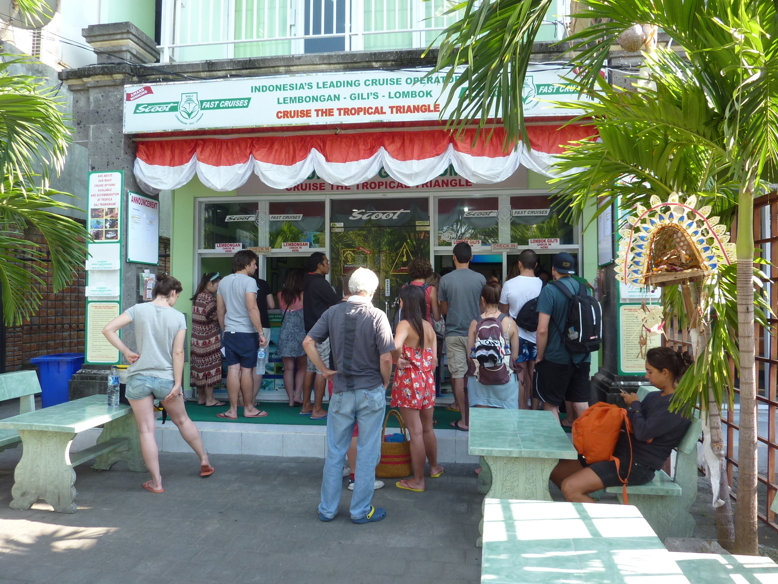 The Eco Stay arranged for us to take the fast boat to Gili T, a two-hour boat ride leaving at 0930. From there we would take the slow boat, 15 minutes, to Gili Meno. The driver dropped us off in Sanur at Scoot, the boat company we were to use, waited until we had our tickets and then drove off to pick up someone else. We were to wait for a little shuttle van to take us to the boat.