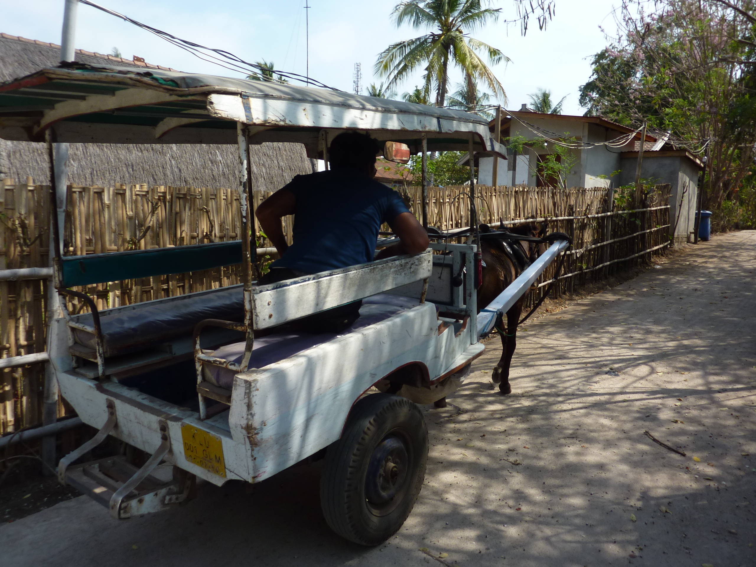 This has been like four vacations in one. First was the hubbub of Ubud, then the zen-like tranquility of Bali Eco Stay. Now we’re off to a totally new experience of island life. Five relaxing days on Gili Meno. There are three tiny islands east of Bali off the NW coast of Lombok. Gili Trawangan, the largest, is known as the party island with all-night raves. Gili Air is a cross between laid back and party. And Gili Meno is the smallest and quietest “the perfect setting for your desert-island fantasy.”