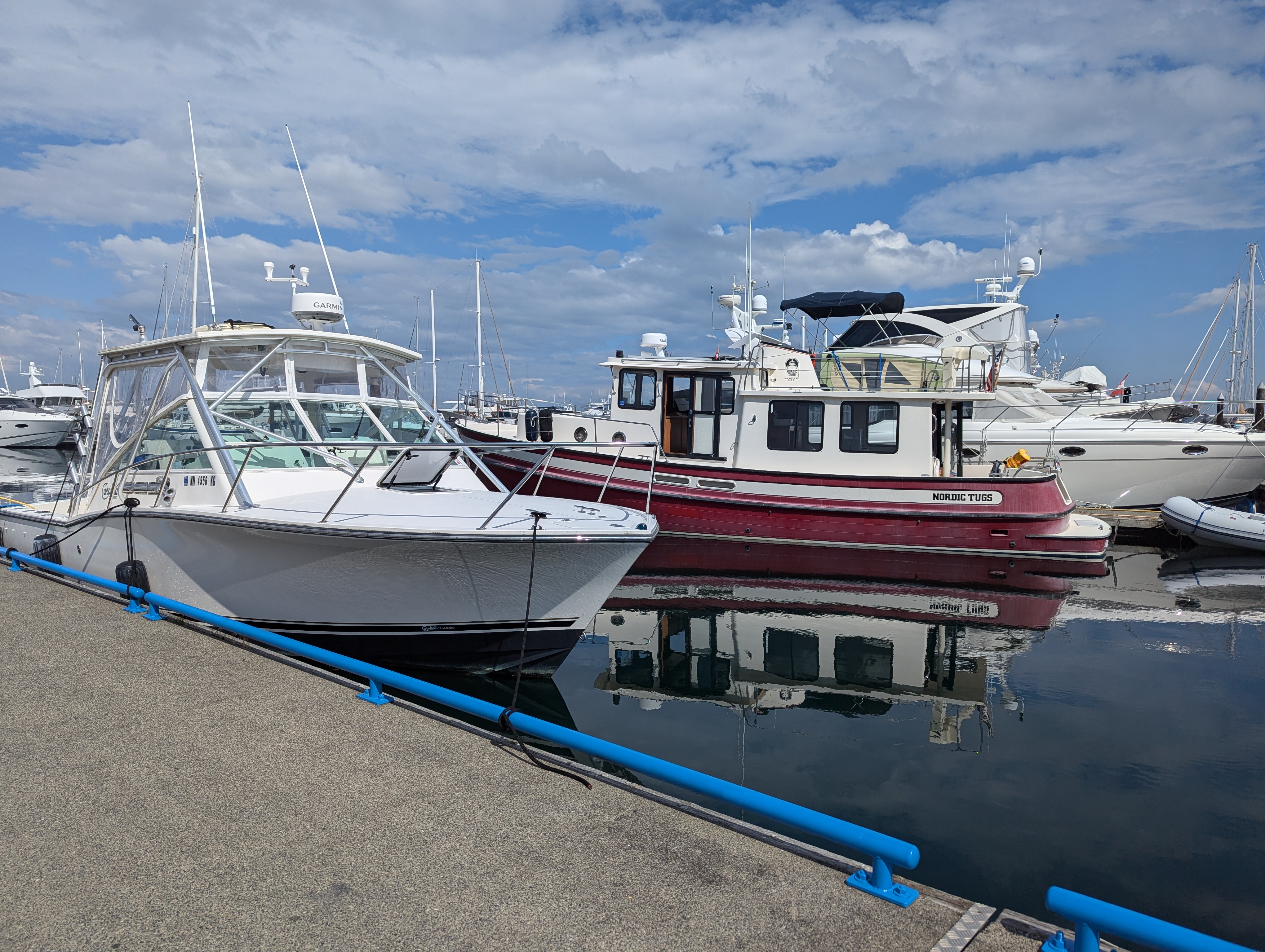 We have a new (to us) 28 foot Carolina Classic power boat (on left below). Justin and Lauren have a new (to them as of last year) 37 foot Nordic Tug (red and white below). So we are cruising together-ish.