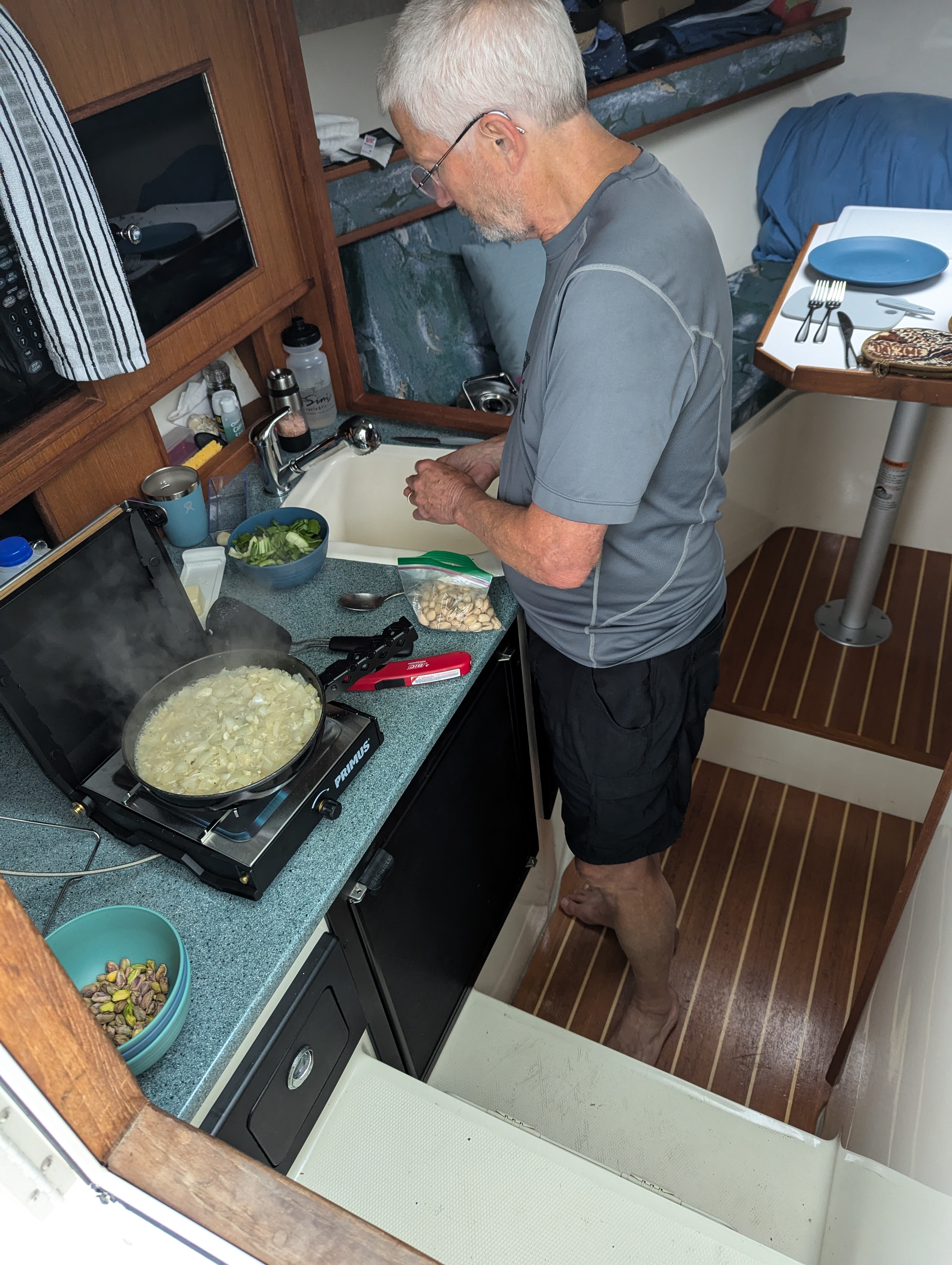 Back on the boat we cooked our first big dinner onboad – rice with onions, garlic, bok choy and pistachios. Yum!