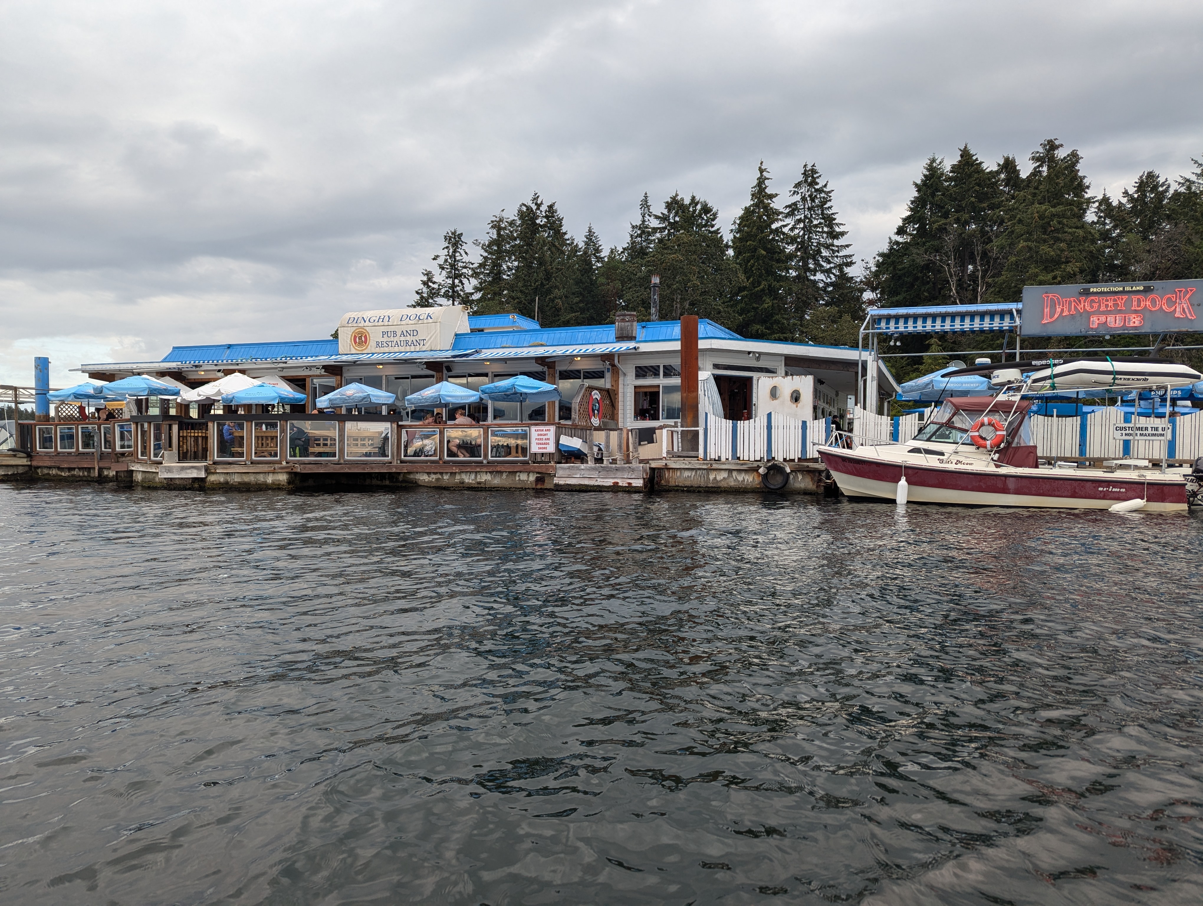 By mid-afternoon we took the passenger ferry back to the island and after a quick shower we hopped into our dinghy and rowed over to the Dinghy Dock Pub on the island next door for a great dinner.