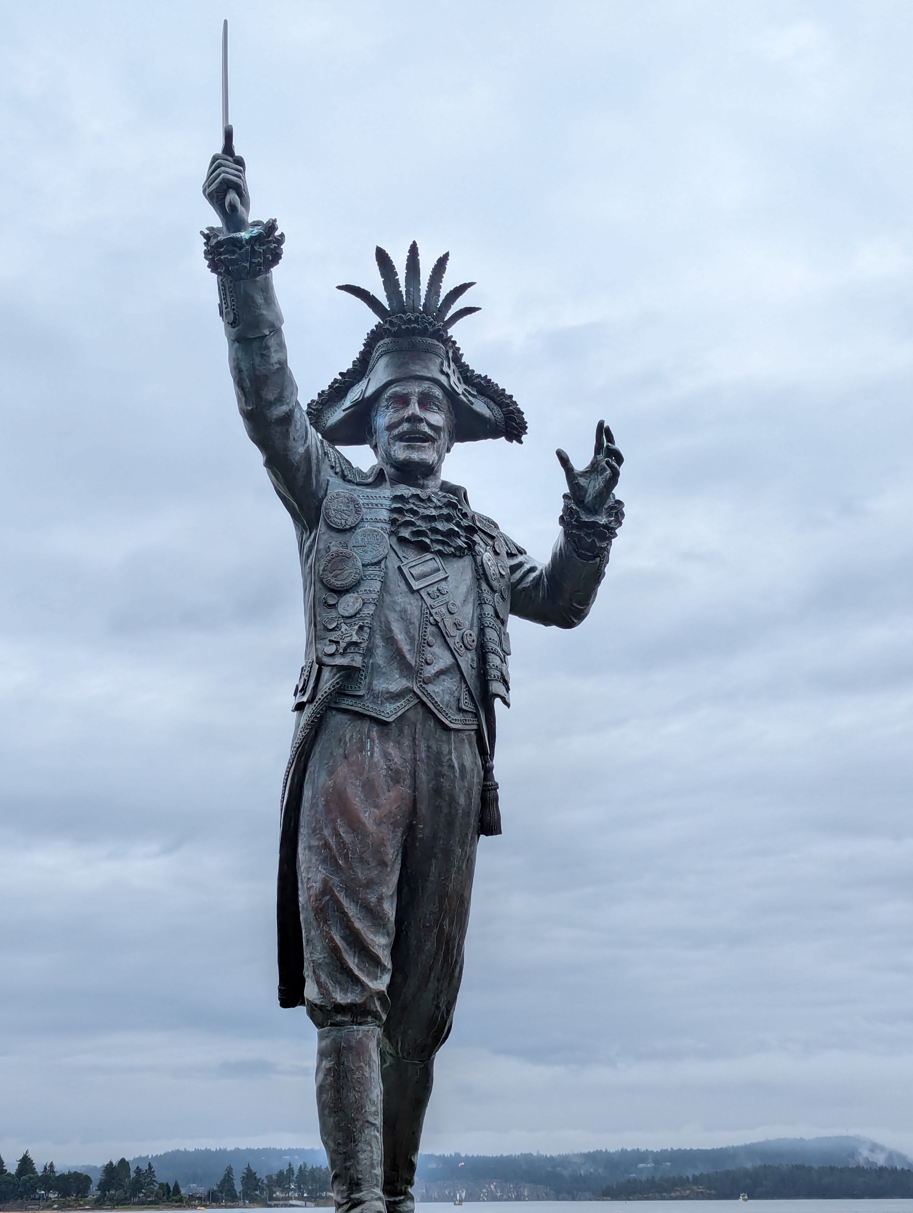 Turns out this scupture is of Frank James Ney (1918-1992) in his pirate costume. Ney was mayor of Nanaimo from 1967-1984 and 1986-1990 serving 21 years overall. Mayor Frank Ney is immortalized in bronze, standing atop a rock, dressed in the gaudy pirate costume he would wear during the town’s annual bathtub races.